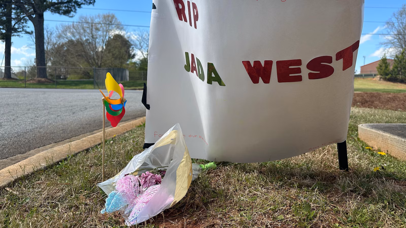 A paper sign staked into the ground near the scene of the fight said, “RIP JADA WEST,” and bore the message: “Heaven gain an angel.” A bouquet and a plastic pinwheel were left beside it.