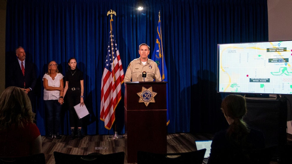 FILE – Las Vegas police Lt. Jason Johansson speaks during a news conference about a series of hit-and run-crashes, Tuesday, Sept. 19, 2023, in Las Vegas. Two teenagers were indicted, Friday, Oct. 6, on more than a dozen charges, including murder and burglary, after police say they targeted and killed a bicyclist while driving a stolen vehicle. (AP Photo/Ty O’Neil, File)