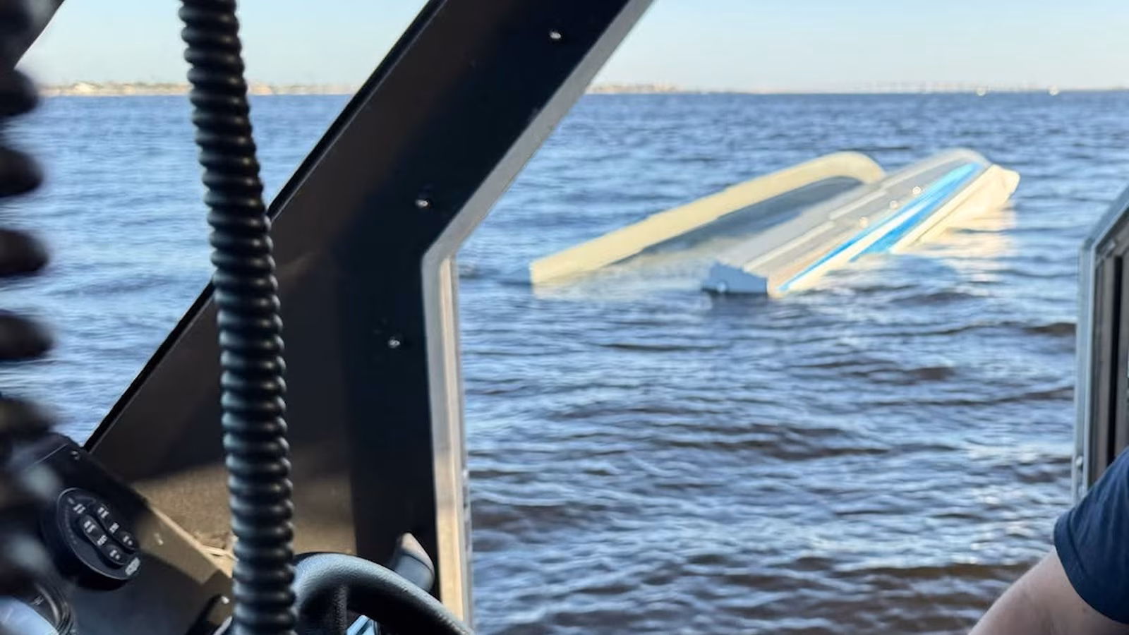 An overturned catamaran is seen, November 29, 2025, through the window of a rescue boat after an accident that killed three of the vessel’s passengers and left one in critical condition, officials said.