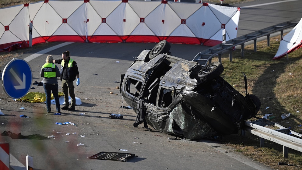 Police attendants stand by an overturned vehicle on highway A94 near Muehldorf, Germany, Friday, Oct. 13, 2023. A vehicle trying to evade a police check in southern Germany left a highway at high speed on Friday and crashed, killing seven people, authorities said. The overcrowded vehicle appeared to be carrying migrants. The accident happened near Muehldorf, east of Munich on the A94 highway, which leads to the Austrian border. (Sven Hoppe/dpa via AP)