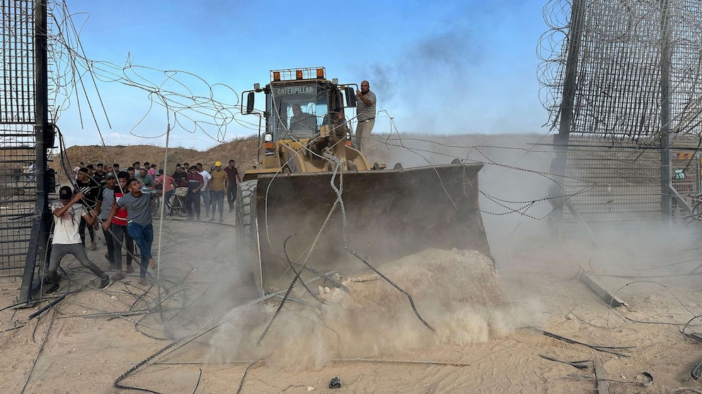 Palestinians cross the border fence with Israel from Khan Yunis in the southern Gaza Strip, on Oct. 7, 2023.