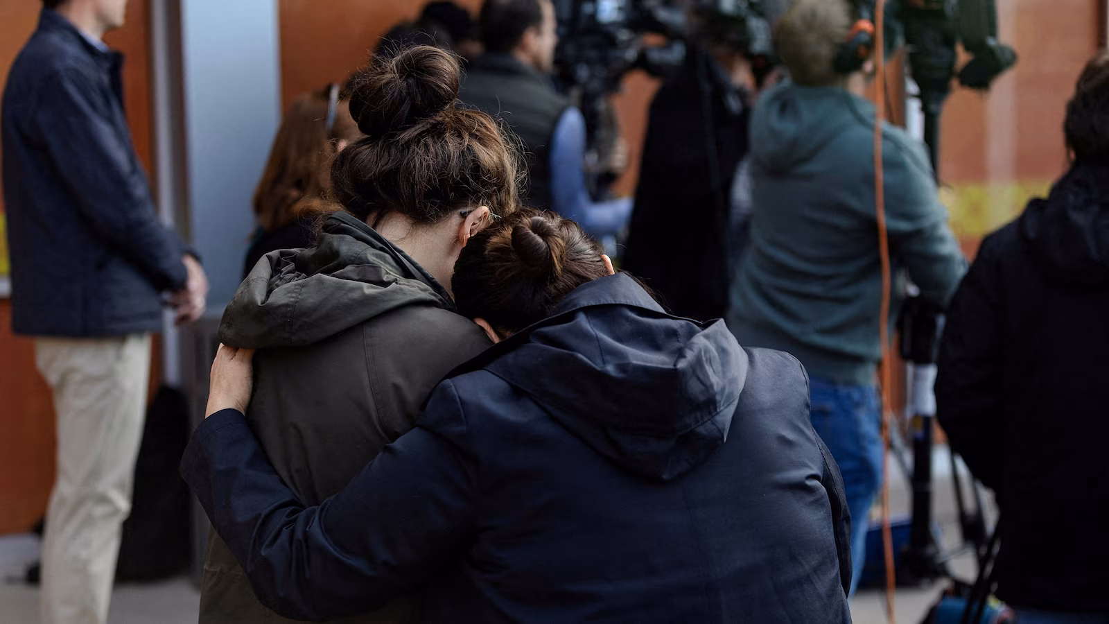 Two parents embrace each other outside of the Rayito De Sol Spanish Immersion Daycare and Pre-School, where federal agents conducted an immigration raid that ended in a teacher being detained, in Chicago, Illinois, U.S., Nov. 5, 2025.