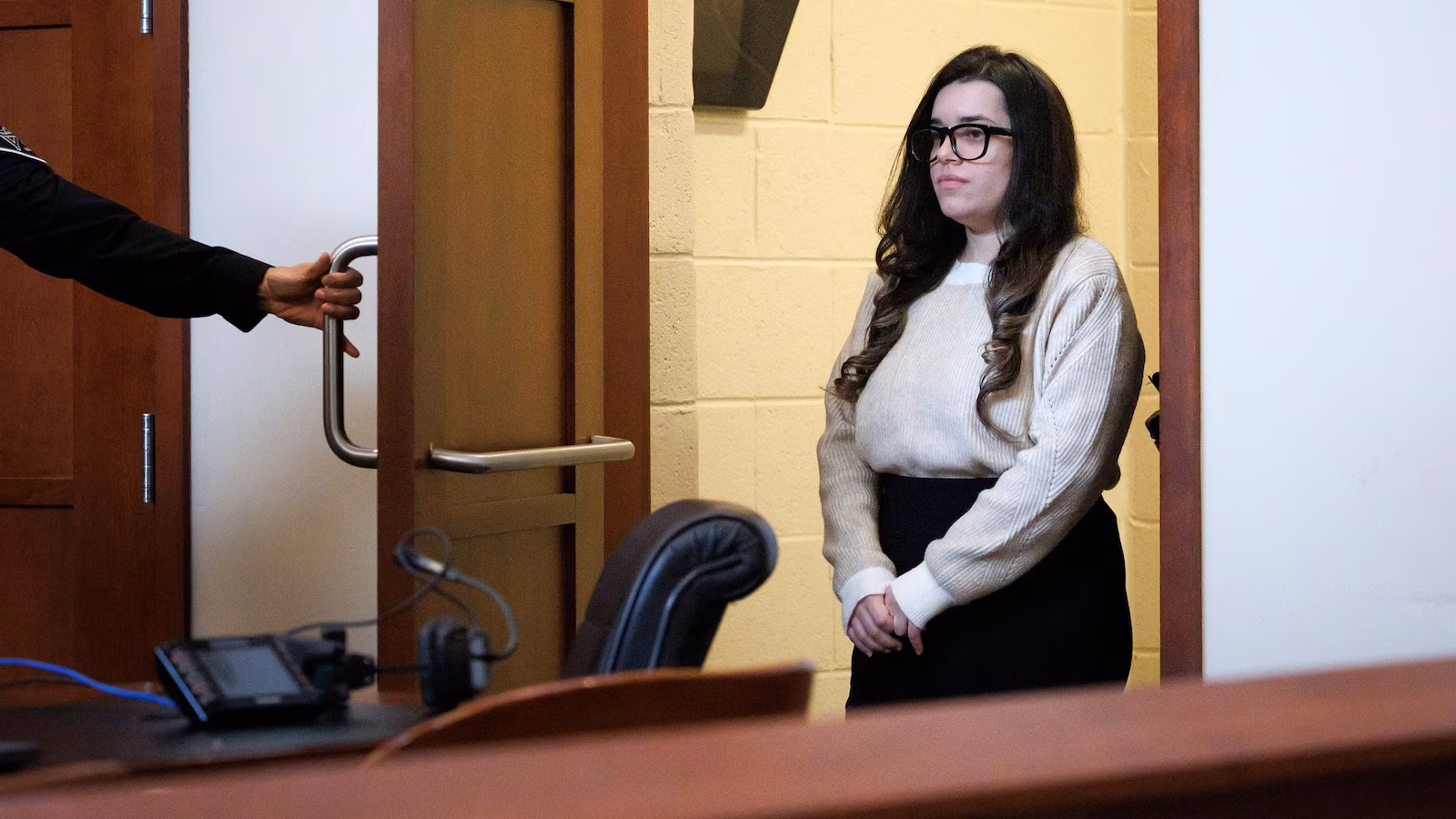 Juliana Peres Magalhaes is escorted into the courtroom before continuing her testimony, during the double murder trial for Brendan Banfield in Fairfax County Circuit Court, on Jan. 14, 2026, in Fairfax, Va.