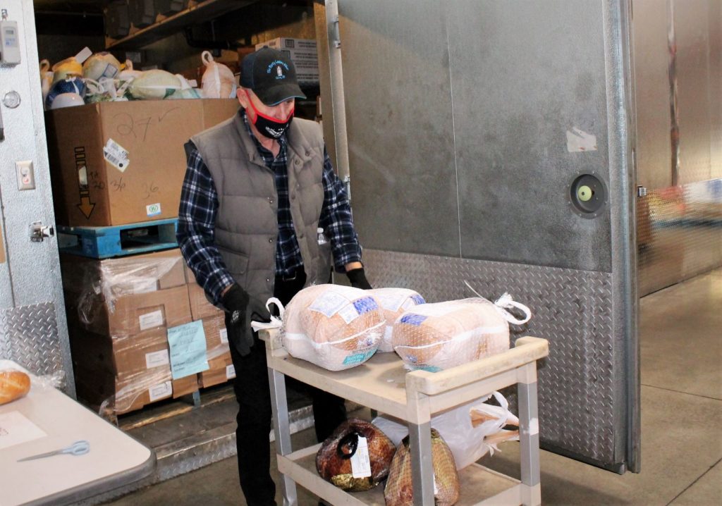 A file photo of Farrell Layne from Hyde Park pulls a cart with turkeys and hams to the freezer.