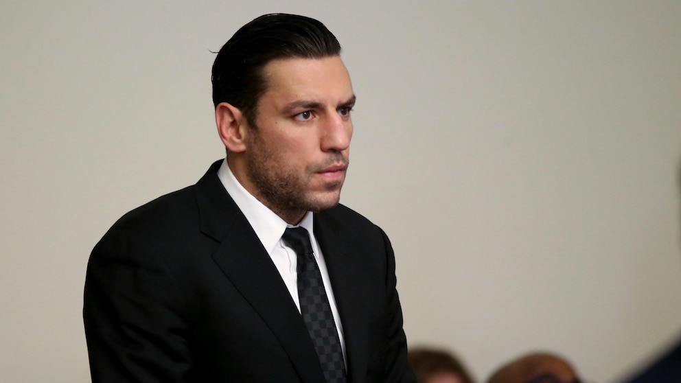 Boston Bruins forward Milan Lucic stands during his arraignment Tuesday, Nov. 21, 2023, in Boston Municipal Court, in Boston, on an assault charge in connection with his arrest over the weekend after his wife called police to their home and said he tried to choke her. Lucic has been released on personal recognizance bail after pleading not guilty to assaulting his wife. (Jonathan Wiggs/The Boston Globe via AP, Pool)