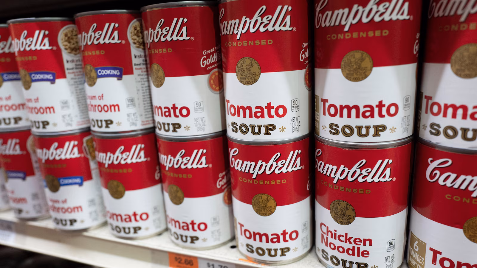 Cans of Campbell’s soup are displayed in a supermarket, March 25, 2021, in New York.