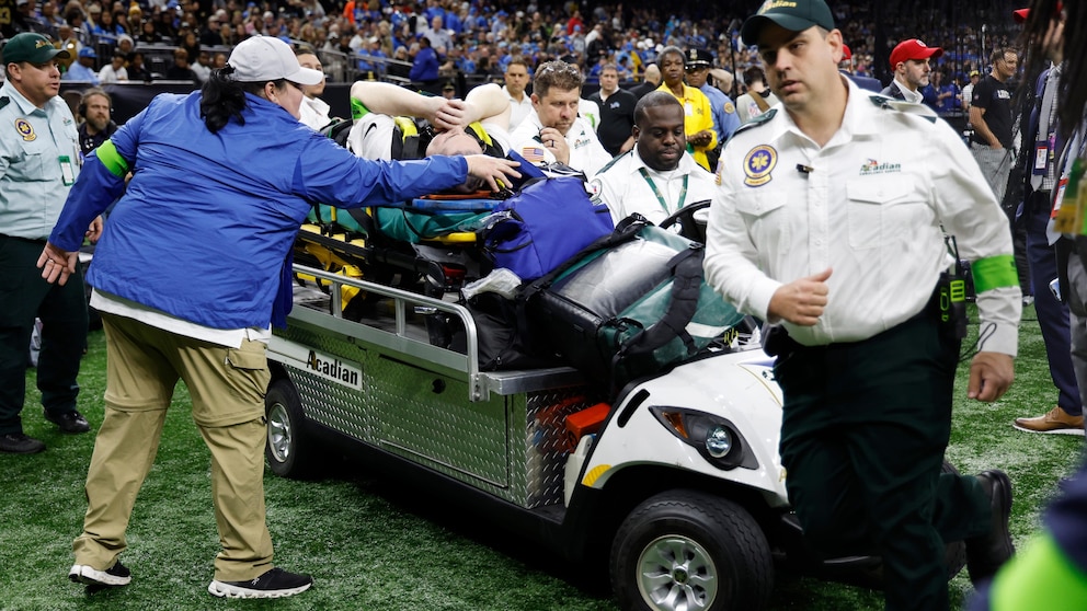 A member of the chain crew is wheeled off during the first half of an NFL football game between the New Orleans Saints and the Detroit Lions, Sunday, Dec. 3, 2023, in New Orleans. (AP Photo/Butch Dill)