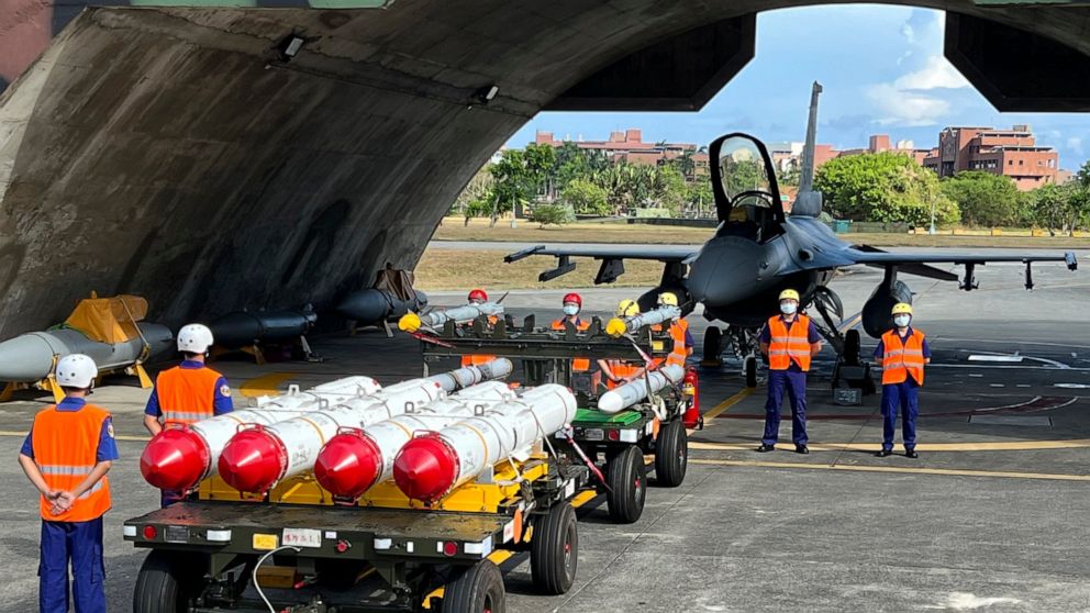 Military personnel stand next to U.S. Harpoon A-84, anti-ship missiles and AIM-120 and AIM-9 air-to-air missiles prepared for a weapon loading drills in front of a U.S. F-16V fighter jet at the Hualien Airbase in Taiwan’s southeastern Hualien county, Wednesday, Aug. 17, 2022. China announced sanctions on Friday, Sept. 16, 2022, against the CEOs of American defense contractors Raytheon and Boeing Defense over a major U.S. arms sale to rival Taiwan. (AP Photo/Johnson Lai, File)