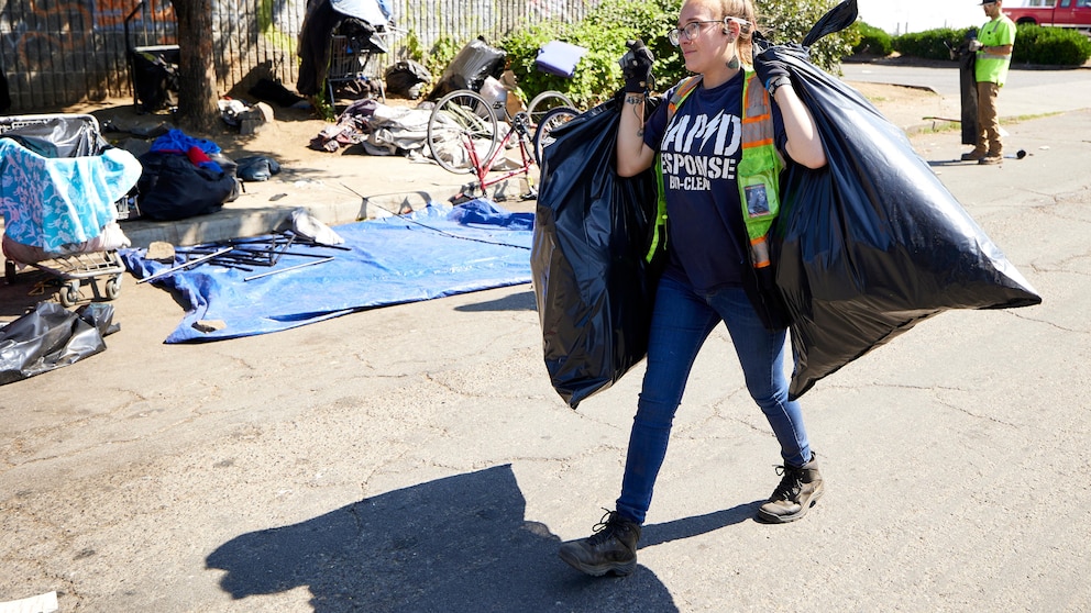 Angelique Risby, 29, watched as workers in neon-yellow vests shoveled piles of litter into black garbage bags. Risby, who has been homeless for two years, said she was prepared for a drill she’s done multiple times.