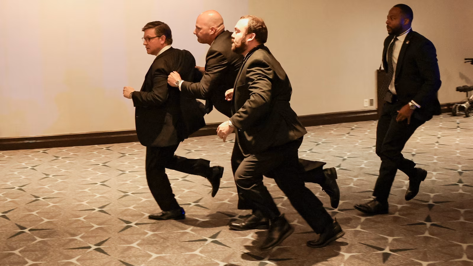 Security officials evacuate U.S. House Speaker Mike Johnson at the annual White House Correspondents’ Association dinner in Washington, April 25, 2026.