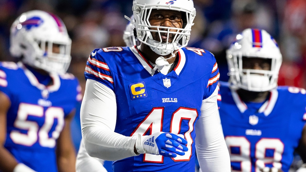 FILE – Buffalo Bills linebacker Von Miller (40) looks on before an NFL football game, Thursday, Oct. 26, 2023, in Orchard Park, NY. Bills premier edge rusher Von Miller says his surgically repaired right knee has shown gradually improvement with Buffalo preparing to host his former team on Monday night. (AP Photo/Matt Durisko, File)