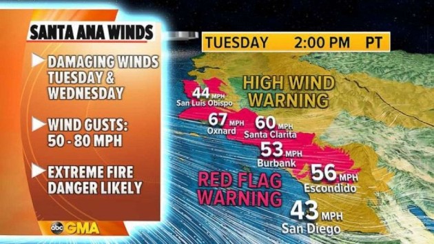 (NEW YORK) — The National Weather Service is warning that winds 50 to 80 mph are expected for California Tuesday with extreme fire danger.