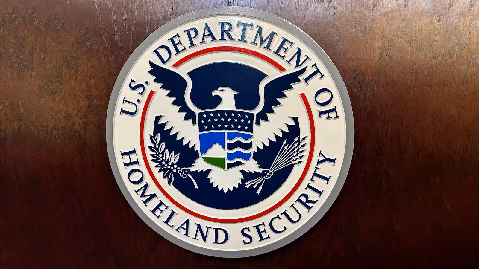 A Department of Homeland Security seal on a podium at Immigration and Customs Enforcement (ICE) headquarters, Mar. 13, 2024.