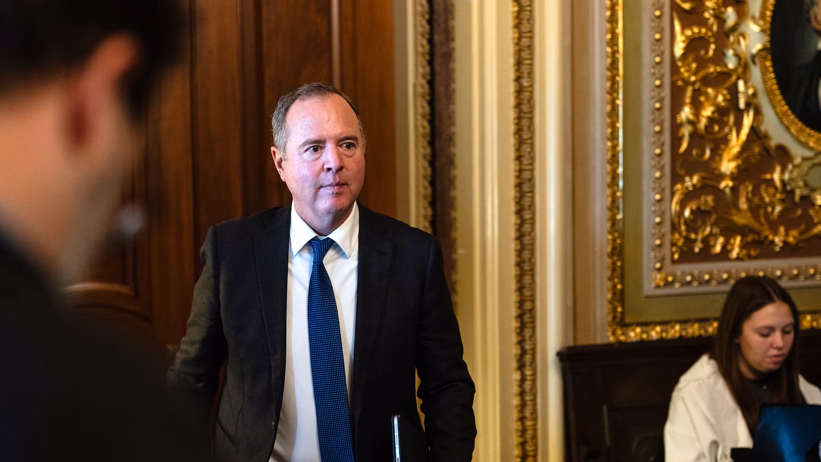 Sen. Adam Schiff departs a Democratic luncheon at the U.S. Capitol on November 6, 2025 in Washington, DC.
