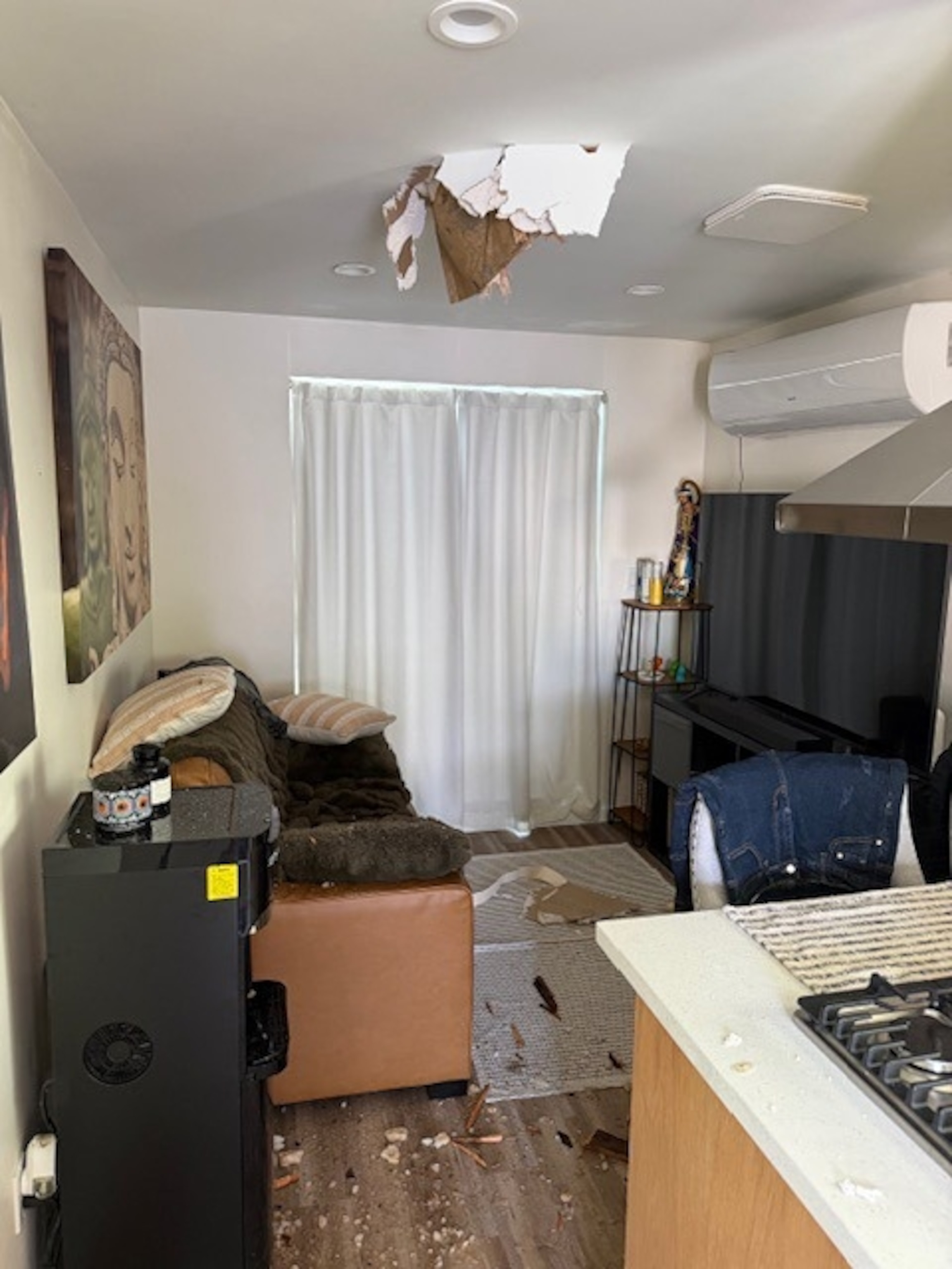 The ice had crashed through the roof and ceiling, according to Hahn’s office, which released photos of the damage to the home.