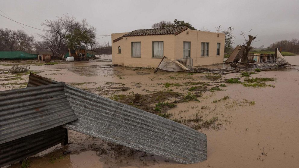 Flood waters inundate a home by the Salinas River near Chualar, California, on on January 14, 2023, as a series of atmospheric river storms continue to cause widespread destruction across the state.