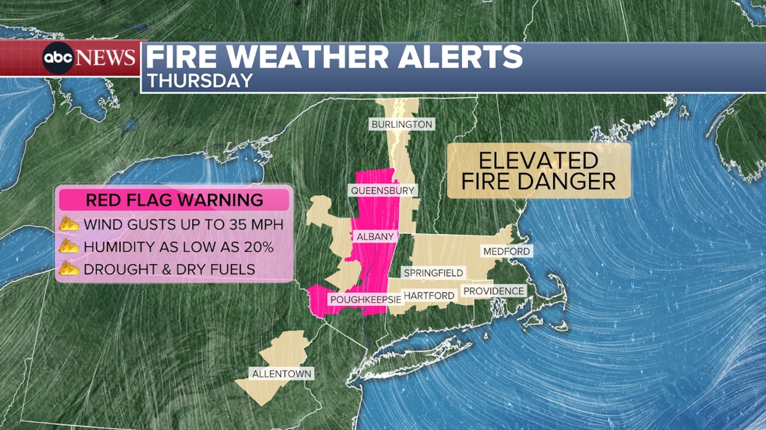 Elevated fire danger to a lesser extent is also in place for other parts of the Northeast, including sections of Pennsylvania, Connecticut, Rhode Island and as far north as Vermont.
