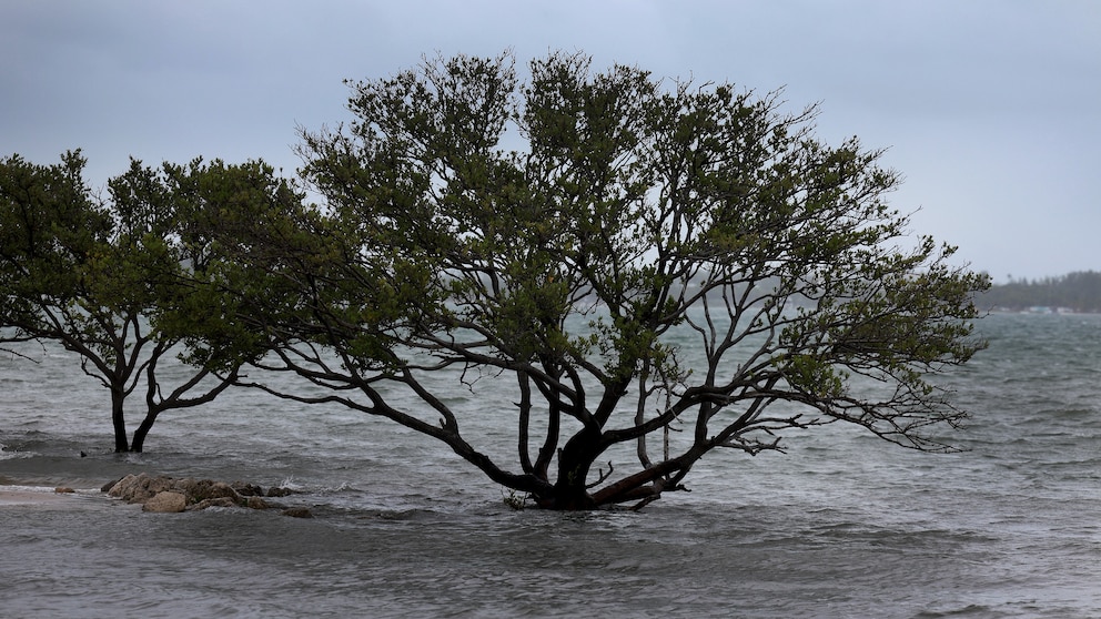 MIAMI, FLORIDA – NOVEMBER 15: Trees are surrounded by the water from Biscayne Bay as seasonal king tides arrive along with a slow moving rain storm on November 15, 2023 in Miami, Florida. A weather system slowly passing through South Florida is leaving Miami-Dade soaked and causing concern for potential flooding. (Photo by Joe Raedle/Getty Images)