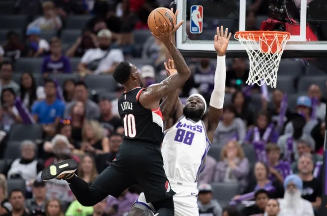 Sacramento Kings’ Neemias Queta (88) defends Portland Trail Blazer’s Nassir Little (10) during the second half of an NBA preseason basketball game in Sacramento, Calif., Sunday, Oct. 9, 2022. Kings won 126-94. (AP Photo/José Luis Villegas)
