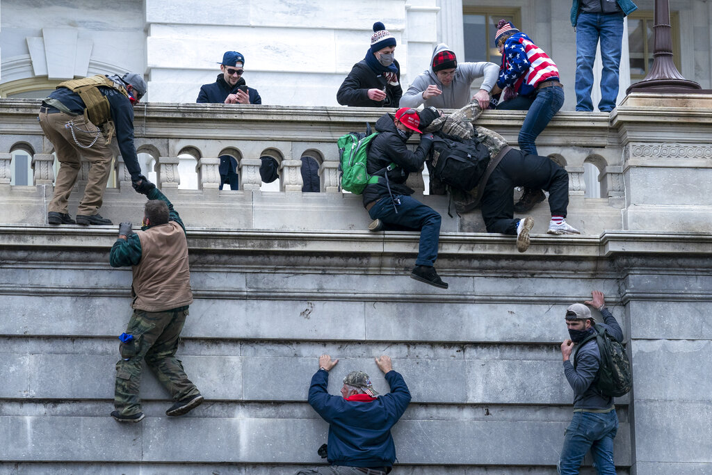 FILE – Rioters loyal to President Donald Trump climb the west wall of the the U.S. Capitol, Jan. 6, 2021, in Washington. (AP Photo/Jose Luis Magana, File)