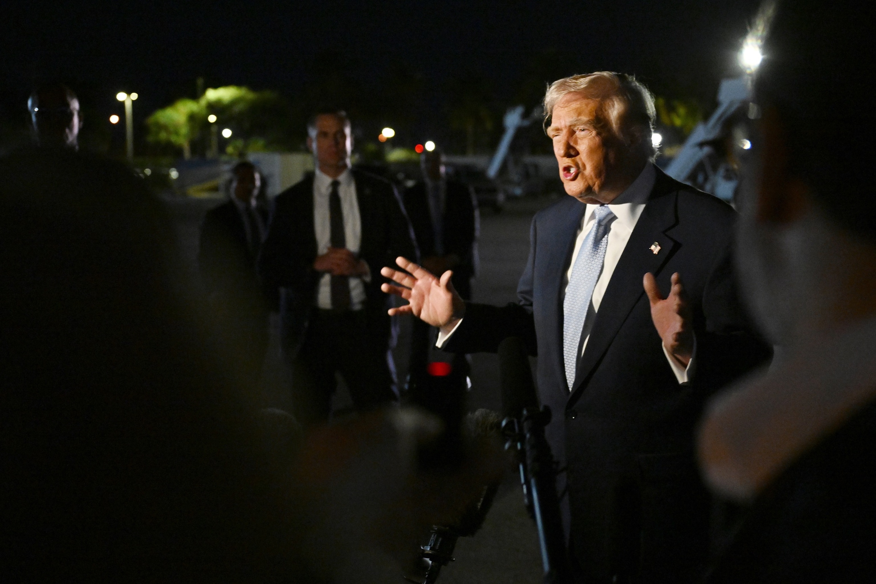 Donald Trump speaks to reporters before boarding Air Force One on November 16, 2025 at Palm Beach International Airport in West Palm Beach, Florida.