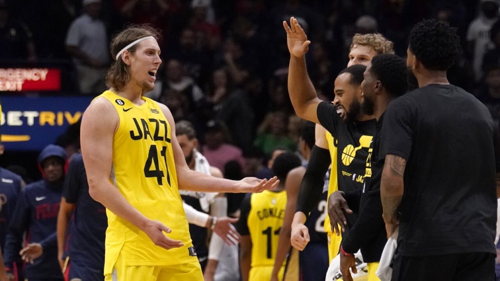 Utah Jazz forward Kelly Olynyk (41) celebrates after defeating the New Orleans Pelicans in overtime during an NBA basketball game in New Orleans, Sunday, Oct. 23, 2022. The Jazz won122-121. (AP Photo/Gerald Herbert)