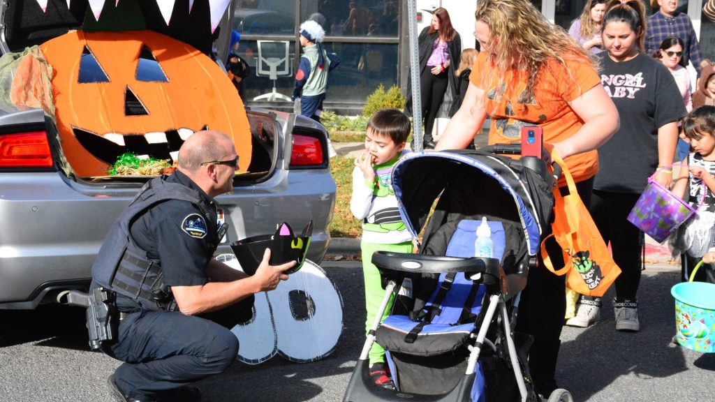 Lt. Brett Randall passing out candy to kids at the police department’s Trunk or Treat, Oct. 31, 2022. (Photo: Logan City Police Department)