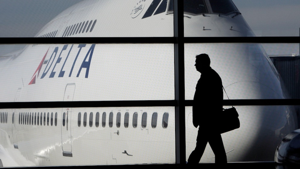 FILE – In this file photo made Jan. 21, 2010, a passenger walks past a Delta Airlines 747 aircraft in McNamara Terminal at Detroit Metropolitan Wayne County Airport in Romulus, Mich. Major airlines are suspending flights to Israel after it formally declared war following a massive attack by Hamas. American Airlines, United Airlines and Delta Air Lines suspended service as the U.S. State Department issued travel advisories for the region citing potential for terrorism and civil unrest. Delta said its Tel Aviv flights have been canceled into this week. (AP Photo/Paul Sancya, File)