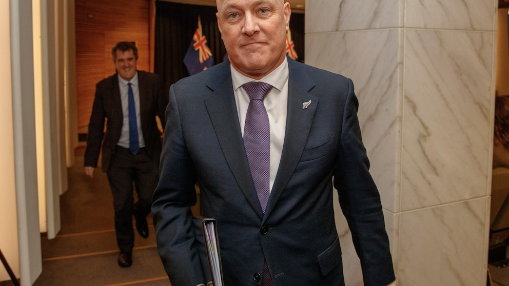 New Zealand Prime Minister Christopher Luxon leaves his first post-Cabinet press conference at Parliament in Wellington, New Zealand, Wednesday, Nov. 29, 2023. (Mark Mitchell/New Zealand Herald via AP)