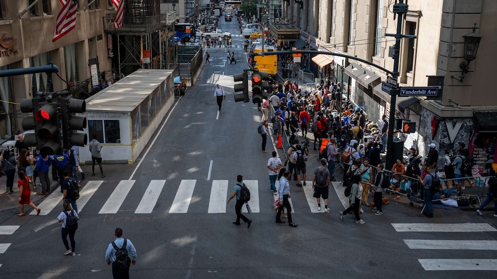 People walk past migrants gathered outside of the Roosevelt Hotel where dozens of recently arrived migrants have been camping out as they try to secure temporary housing, Aug. 2, 2023, in New York.