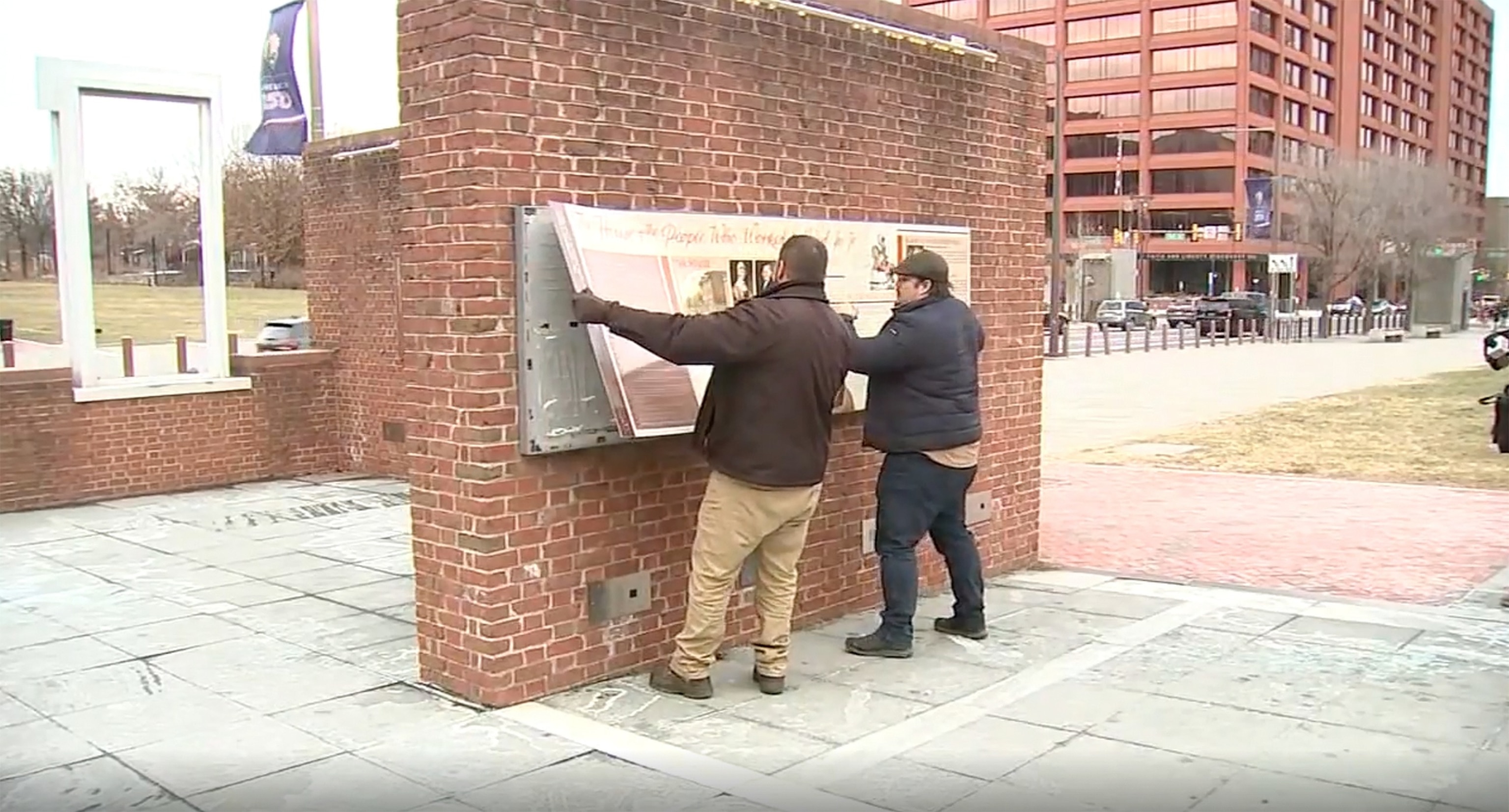 National Park Service staffers are pictured removing panels that are park of the “Freedom and Slavery in the Making of a New Nation” exhibit at the President’s House in Philadelphia.