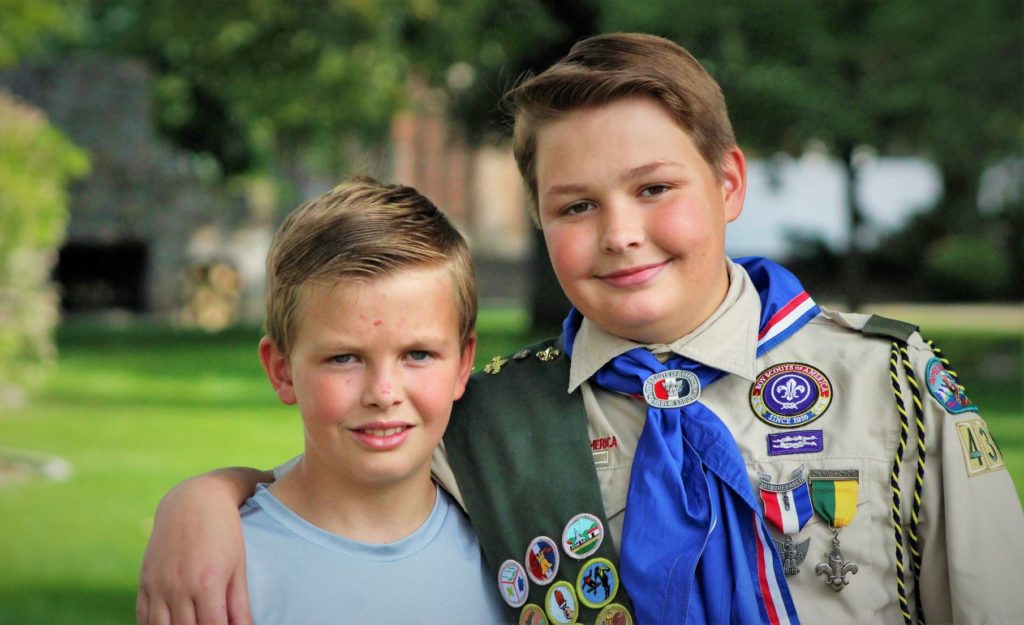 Little brother Skyler climbed up a little higher than everyone and decided to jump to the ground. On his way down his leg caught a branch leaving a gaping wound about 6 inches long and cut to the bone. The 13-year old Eagle Scout knew exactly what to do.