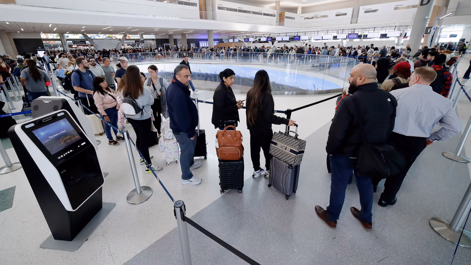 Air travelers endure long lines and two-hour wait times at the TSA security check point at Terminal E at the George Bush Intercontinental Airport, on March 20, 2026, in Houston.
