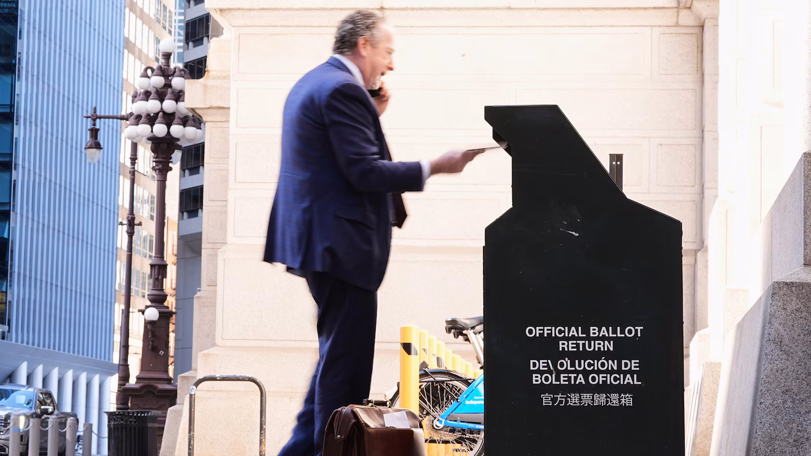 A person places an envelope in a ballot return box for mail-in ballots outside of City Hall in Philadelphia, Oct. 27, 2025.
