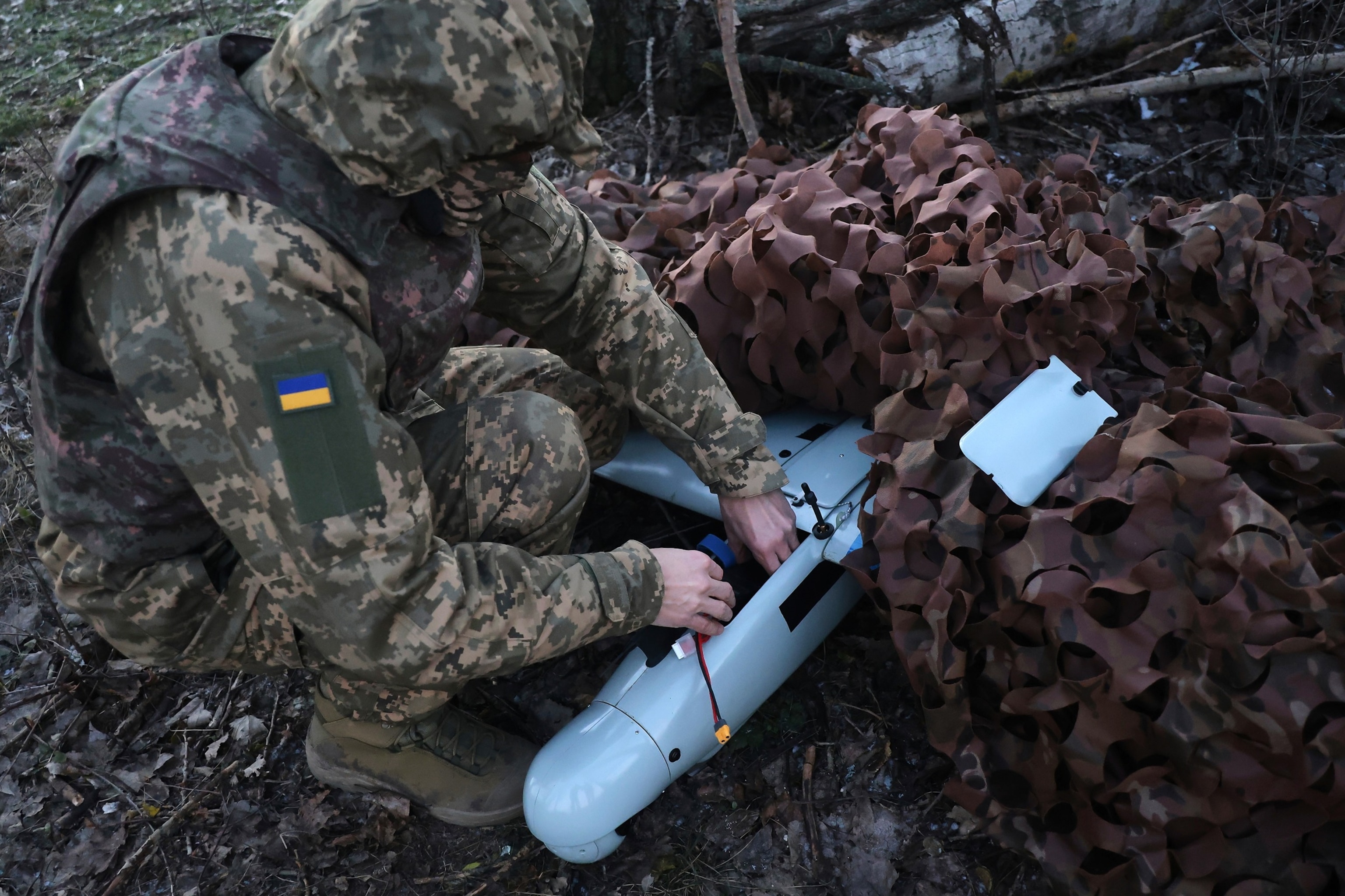 A Ukrainian soldier squats by a drone in the Kharkiv direction in Ukraine, on Dec. 24, 2025.