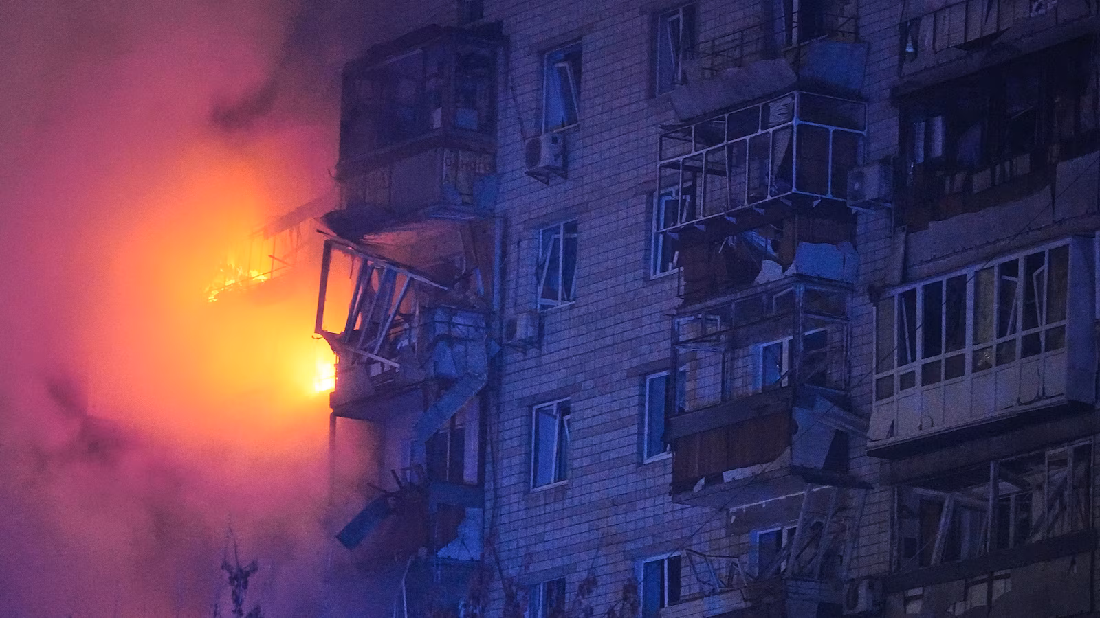 A fire burns at a residential building after a Russian attack in Vyshgorod, outside of Kyiv, Ukraine, early Sunday, Nov. 30, 2025.
