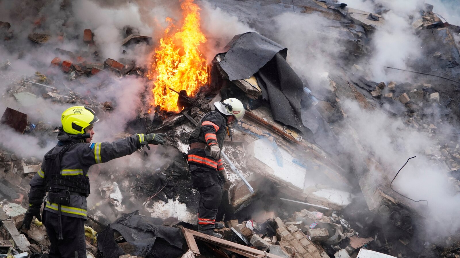Rescuers work the scene of a building damaged by Russian rocket attack in Kharkiv, Ukraine, Tuesday, Jan. 23, 2024.