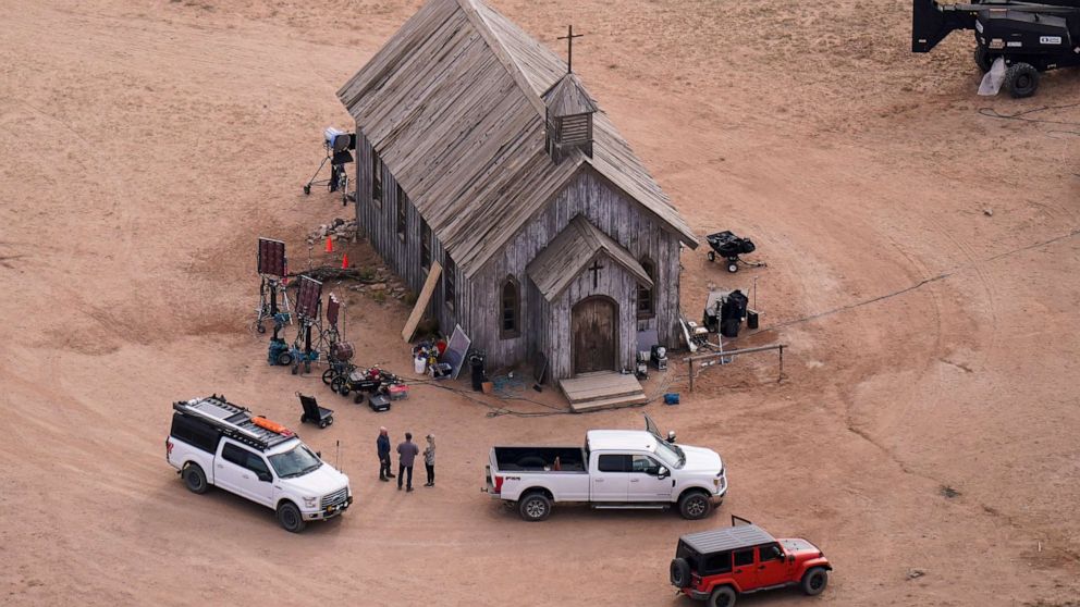 This aerial photo shows the movie set of “Rust” at Bonanza Creek Ranch in Santa Fe, N.M., on Oct. 23, 2021.