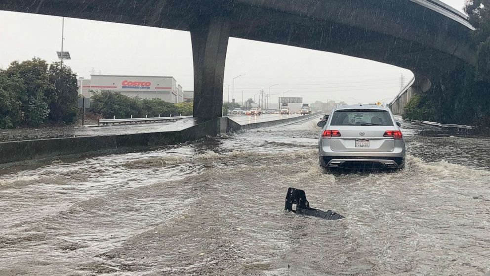 Traffic drives through flooded lanes on Highway 101 in South San Francisco, California, Dec. 31, 2022.