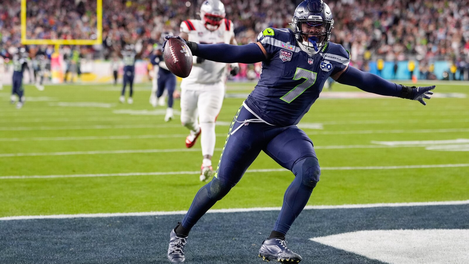 Sam Darnold threw a touchdown pass to AJ Barner, Kenneth Walker III ran for 135 yards and Jason Myers set a super Bowl record by making all five of his field-goal tries.
