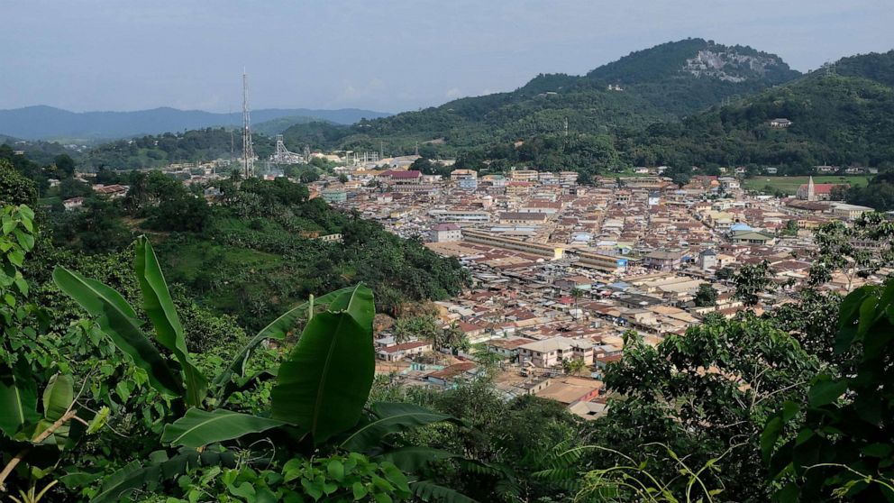 In this July 25, 2019, file photo, the gold-mining town of Obuasi, Ghana, is shown.