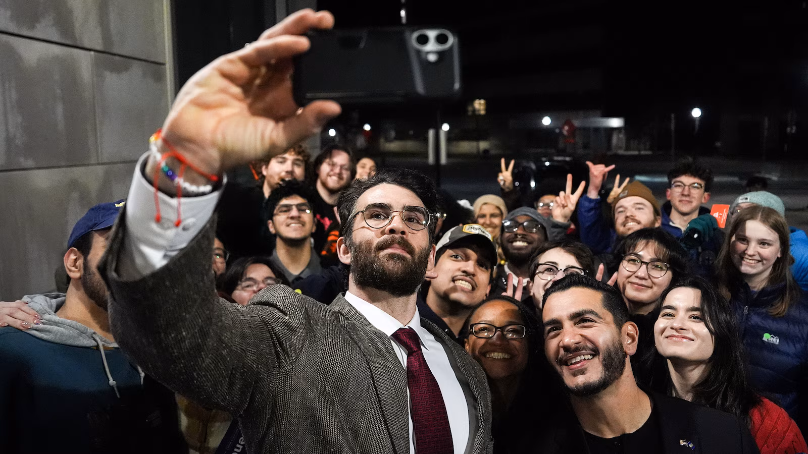 Streamer Hasan Piker and Abdul El-Sayed, a progressive candidate in the Democratic primary for U.S. Senate in Michigan, take a selfie with young fans following a campaign event, April 7, 2026, at the University of Michigan in Ann Arbor, Mich.