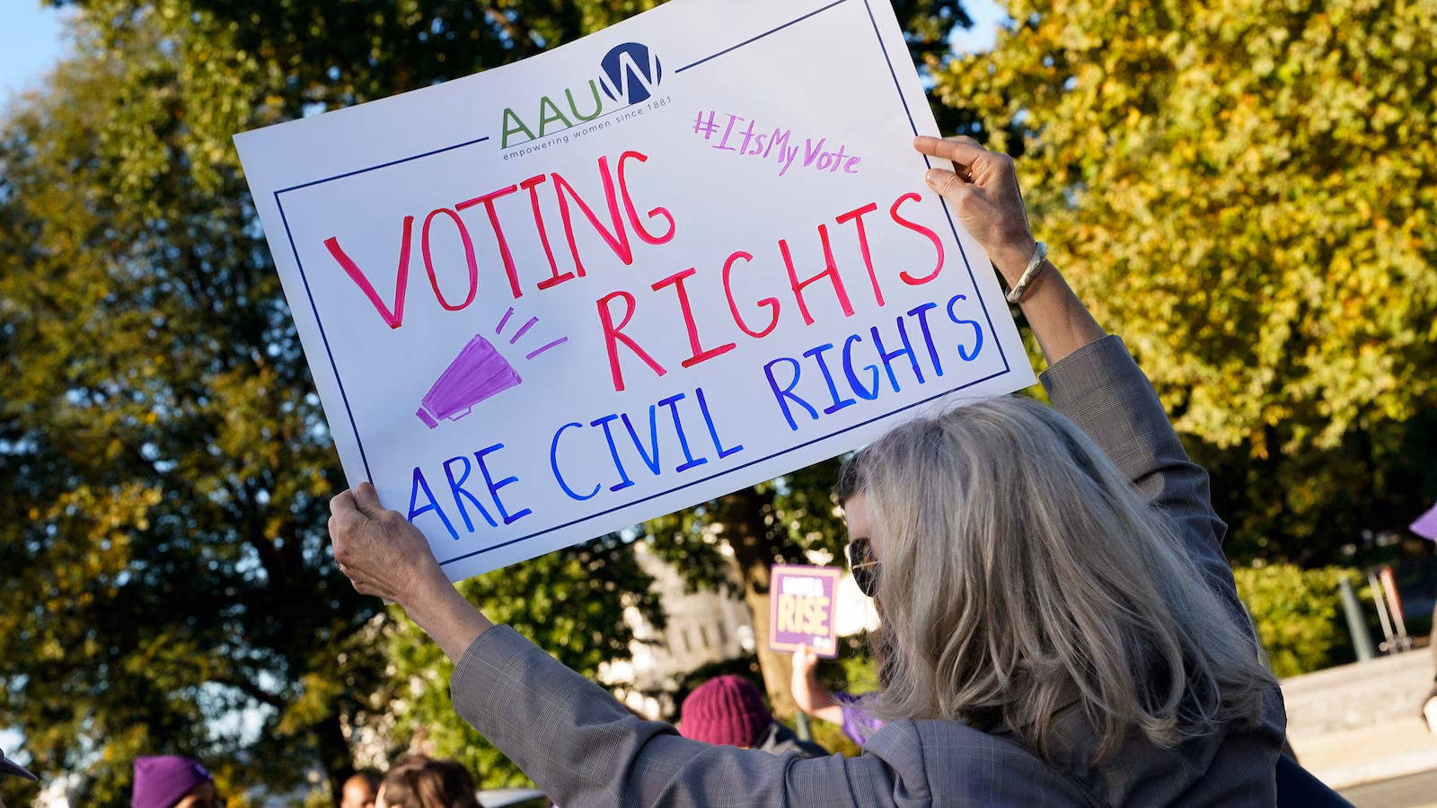 People protest on the day the U.S. Supreme Court hears arguments regarding the composition of Louisiana electoral districts, in Washington, October 15, 2025.