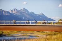 With the Grand Teton in view, racers chase across the Wilson Bike Path Bridge in last year’s LoToJa Classic. After crossing the bridge, cyclists have seven miles to the finish line in the 203-mile road race from Logan, Utah, to Jackson Hole Mountain Resort. This year’s 42nd annual LoToJa will be held on Sept. 7. Photo courtesy of Snake River Photo