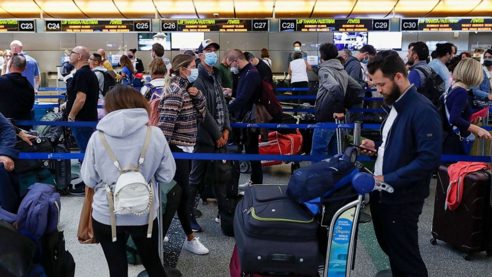 In this May 27, 2022, file photo, travelers wait in check-in lines at Tom Bradley International Terminal at Los Angeles International Airport in Los Angeles.