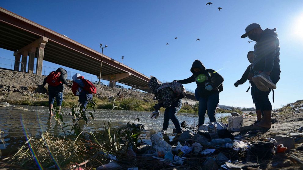 Migrants cross the US-Mexico border from Ciudad Juarez, Mexico, on Dec. 14, 2022.