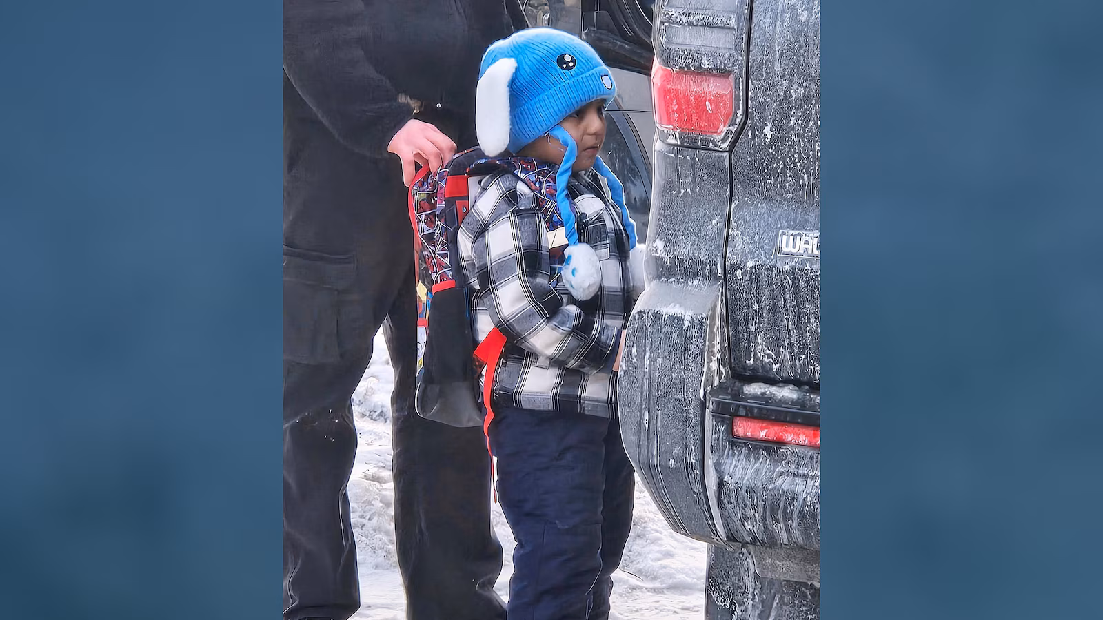 ICE agents stand next to Liam Conejo Ramos, a five-year-old that school officials said was detained in Minneapolis, Minnesota, January 20, 2026.