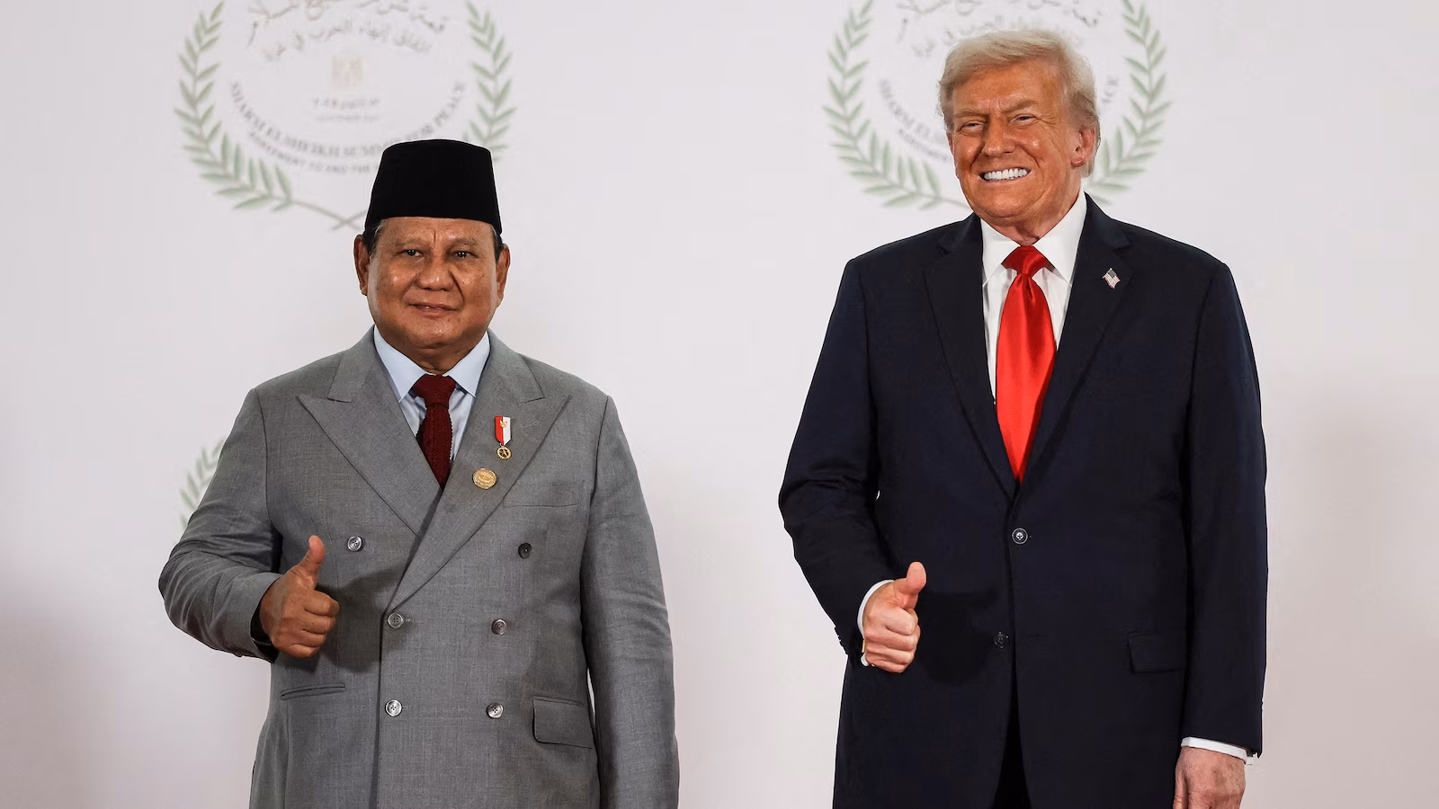 President Donald Trump greets Indonesia’s President Prabowo Subianto during a summit on Gaza in Sharm el-Sheikh, Egypt, on Oct. 13, 2025.