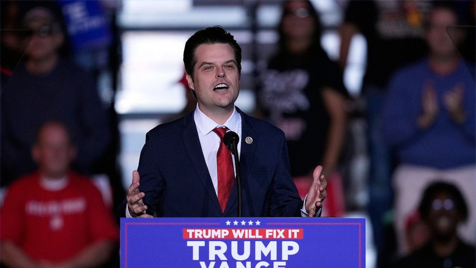 Rep. Matt Gaetz speaks before Republican presidential nominee former President Donald Trump speaks at a campaign rally at Lee’s Family Forum, Oct. 31, 2024, in Henderson, Nev.