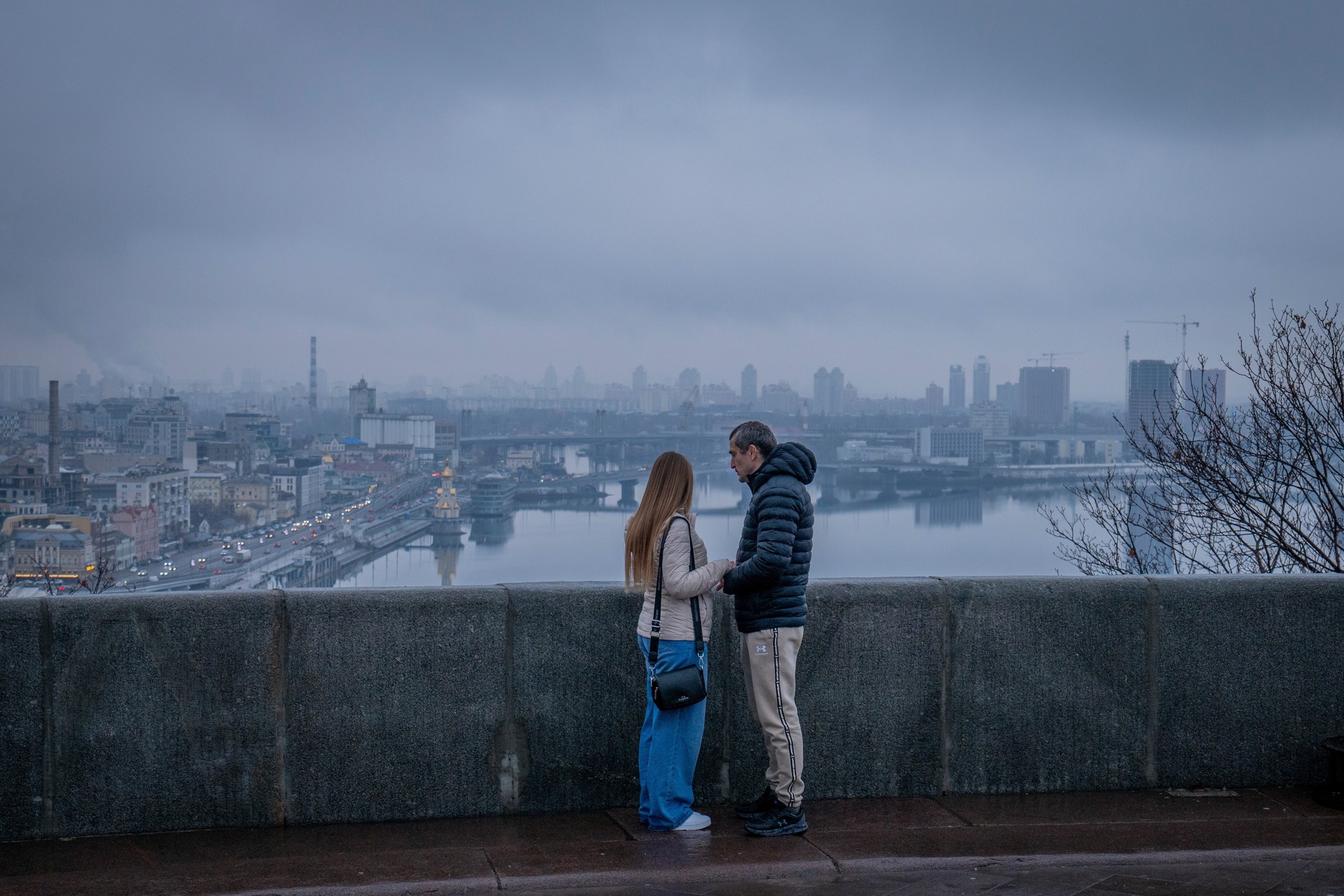 A couple stands on a bridge in Kyiv, Ukraine, on Dec. 1, 2025.